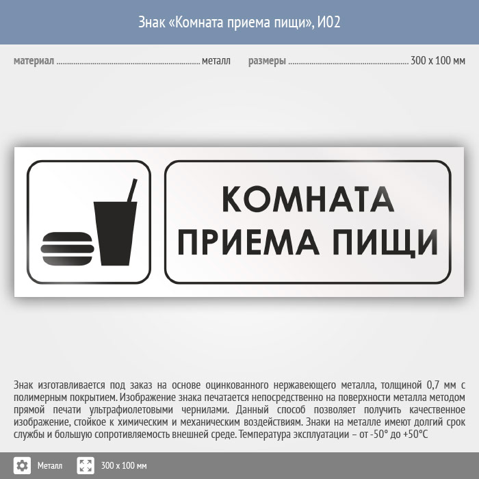 Знак «Комната приема пищи», И02 (металл, 300х100 мм) в Омске купить
