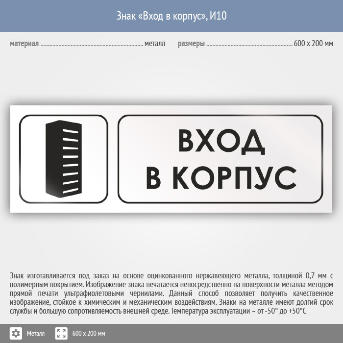 Знак «Вход в корпус», И10 (металл, 600х200 мм) в Омске купить