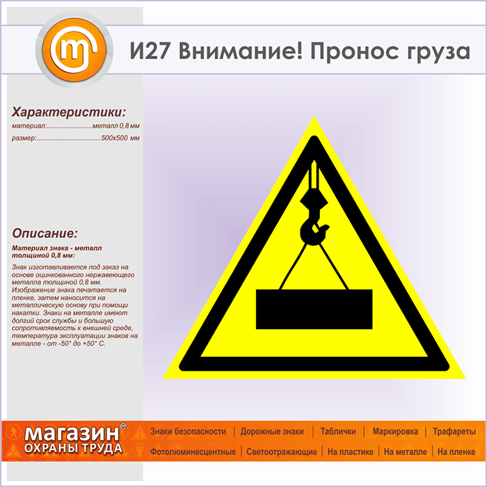 Знак «Внимание! Пронос груза», И27 (металл, сторона 500 мм) в Омске купить