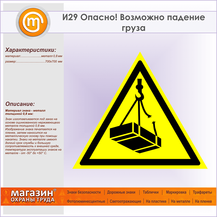 Знак «Опасно! Возможно падение груза», И29 (металл, сторона 700 мм) в Омске купить