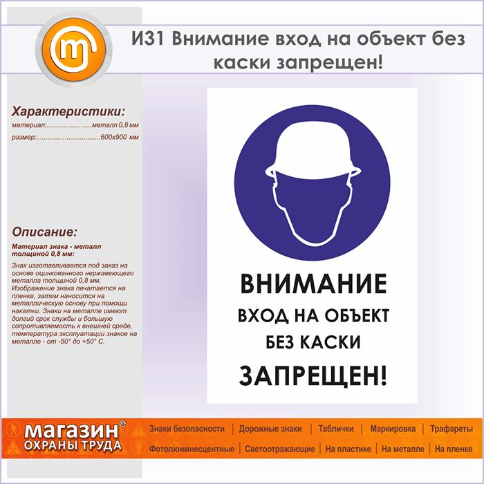 Знак «Внимание вход на объект без каски запрещен!», И31 (металл, 600х900 мм) в Омске купить