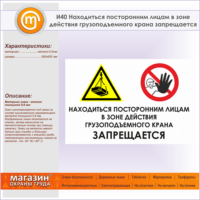 Знак «Находиться посторонним лицам в зоне действия грузоподъемного крана запрещается», И40 (металл, 900х600 мм) в Омске купить