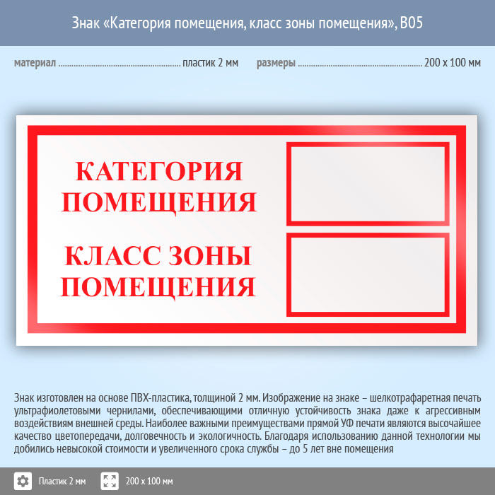 Знак «Категория помещения, класс зоны помещения», B05 (пластик, 200х100 мм) в Омске купить