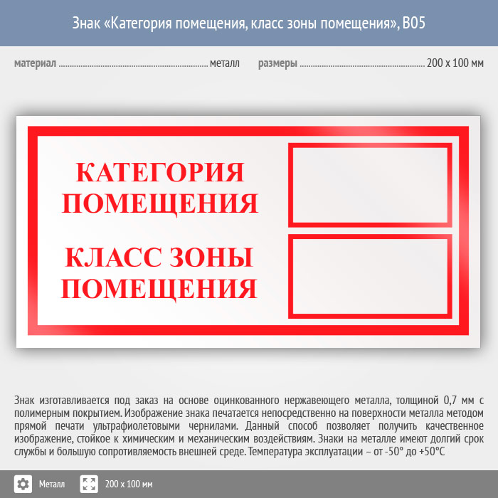 Знак «Категория помещения, класс зоны помещения», B05 (металл, 200х100 мм) в Омске купить