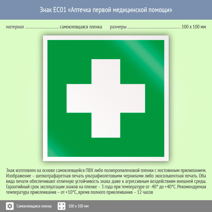 Знак EC01 «Аптечка первой медицинской помощи» (пленка, 100х100 мм) в Омске купить