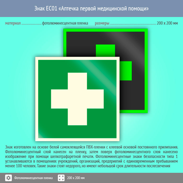 Знак EC01 «Аптечка первой медицинской помощи» (фотолюминесцентная пленка, 200х200 мм) в Омске купить