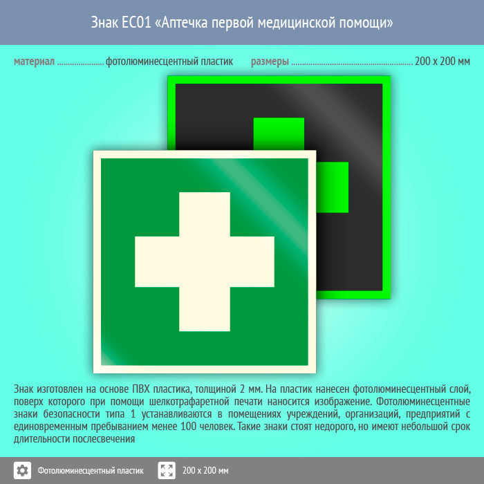 Знак EC01 «Аптечка первой медицинской помощи» (фотолюминесцентный пластик, 200х200 мм) в Омске купить