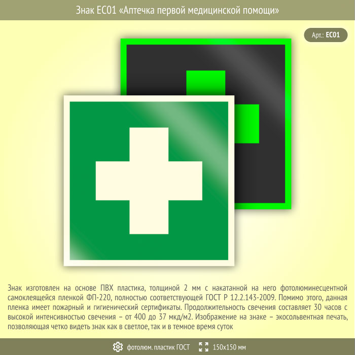 Знак EC01 «Аптечка первой медицинской помощи» (фотолюминесцентный пластик ГОСТ 34428-2018, 150х150 мм) в Омске купить