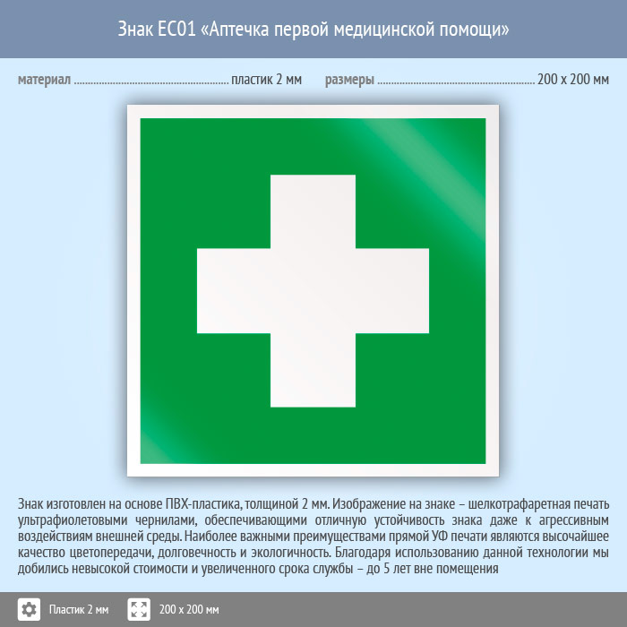 Знак EC01 «Аптечка первой медицинской помощи» (пластик, 200х200 мм) в Омске купить