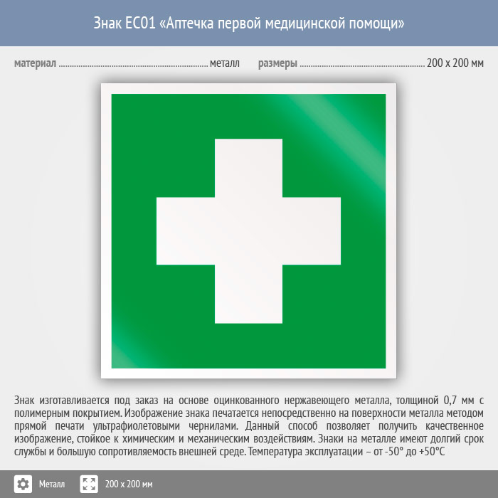 Знак EC01 «Аптечка первой медицинской помощи» (металл, 200х200 мм) в Омске купить