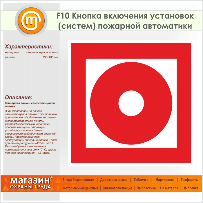 Знак F10 «Кнопка включения установок (систем) пожарной автоматики» (пленка, 100х100 мм) в Омске купить