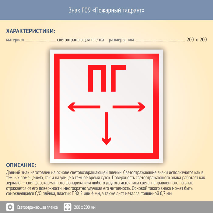 Знак F09 «Пожарный гидрант» (светоотражающая пленка, 200х200 мм) в Омске купить