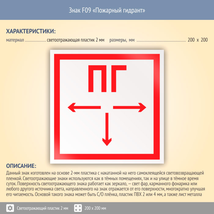 Знак F09 «Пожарный гидрант» (светоотражающий пластик, 200х200 мм) в Омске купить