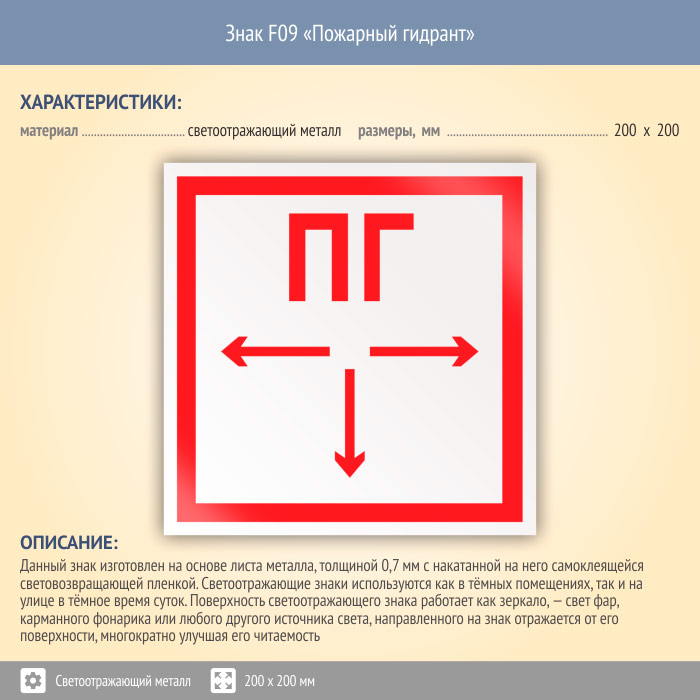 Знак F09 «Пожарный гидрант» (светоотражающий металл, 200х200 мм) в Омске купить