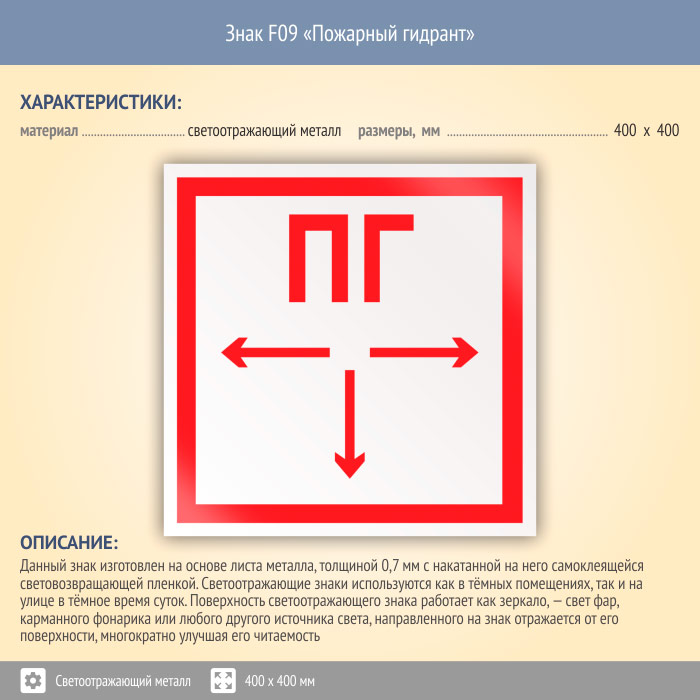 Знак F09 «Пожарный гидрант» (светоотражающий металл, 400х400 мм) в Омске купить