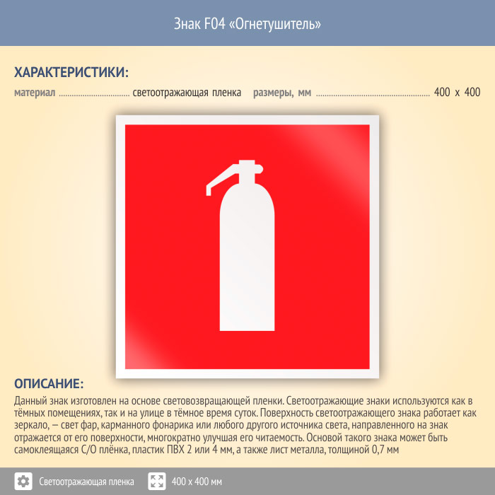 Знак F04 «Огнетушитель» (светоотражающая пленка, 400х400 мм) в Омске купить