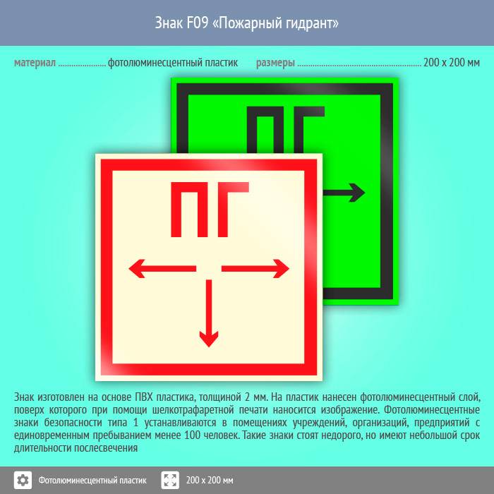 Знак F09 «Пожарный гидрант» (фотолюминесцентный пластик, 200х200 мм) в Омске купить