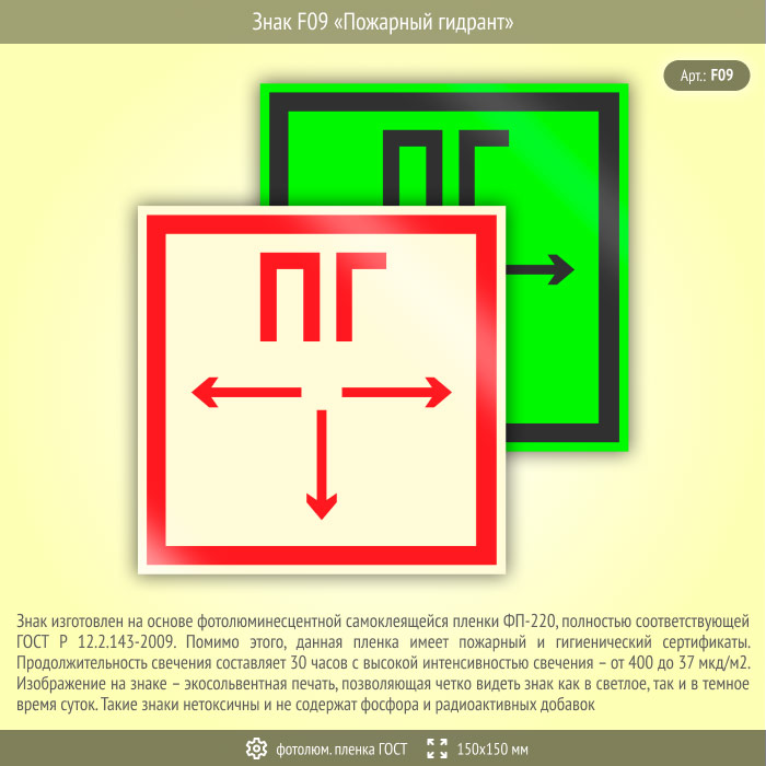 Знак F09 «Пожарный гидрант» (фотолюминесцентная пленка ГОСТ 34428-2018, 150х150 мм) в Омске купить