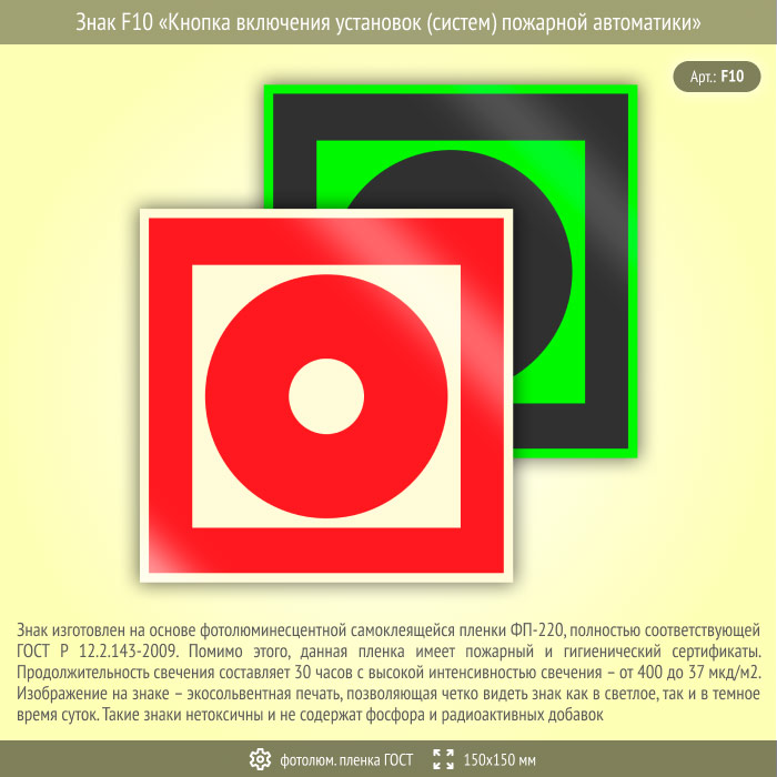 Знак F10 «Кнопка включения установок (систем) пожарной автоматики» (фотолюминесцентная пленка ГОСТ 34428-2018, 150х150 мм) в Омске купить