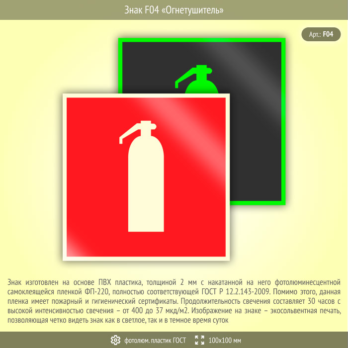 Знак F04 «Огнетушитель» (фотолюминесцентный пластик ГОСТ 34428-2018, 100х100 мм) в Омске купить