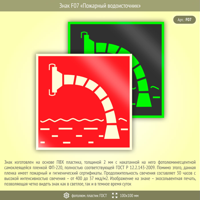 Знак F07 «Пожарный водоисточник» (фотолюминесцентный пластик ГОСТ 34428-2018, 100х100 мм) в Омске купить