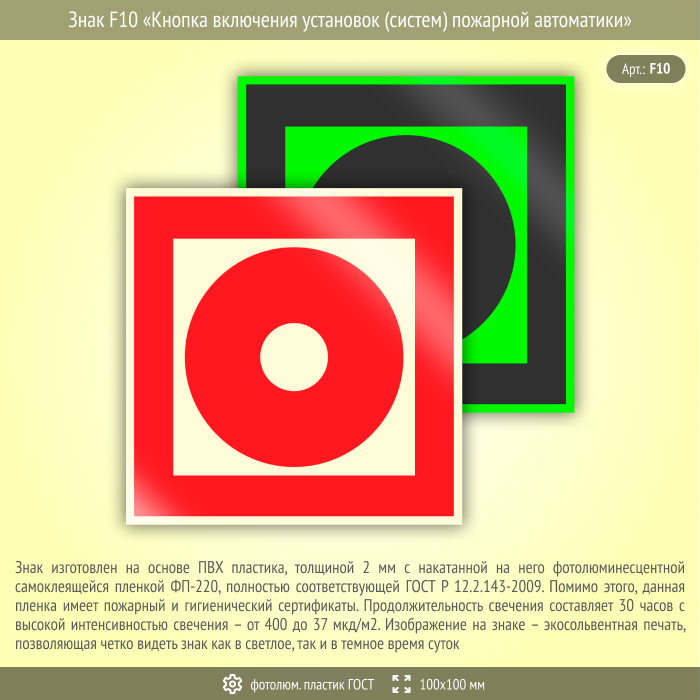 Знак F10 «Кнопка включения установок (систем) пожарной автоматики» (фотолюминесцентный пластик ГОСТ 34428-2018, 100х100 мм) в Омске купить