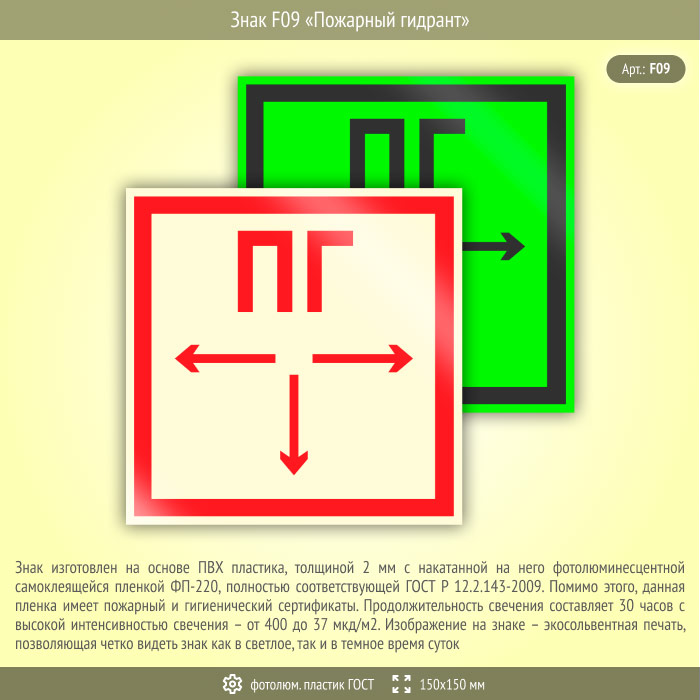 Знак F09 «Пожарный гидрант» (фотолюминесцентный пластик ГОСТ 34428-2018, 150х150 мм) в Омске купить