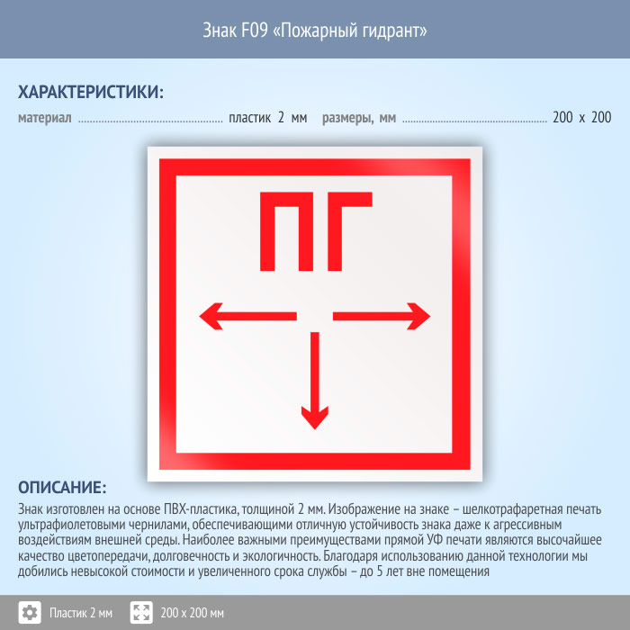 Знак F09 «Пожарный гидрант» (пластик, 200х200 мм) в Омске купить
