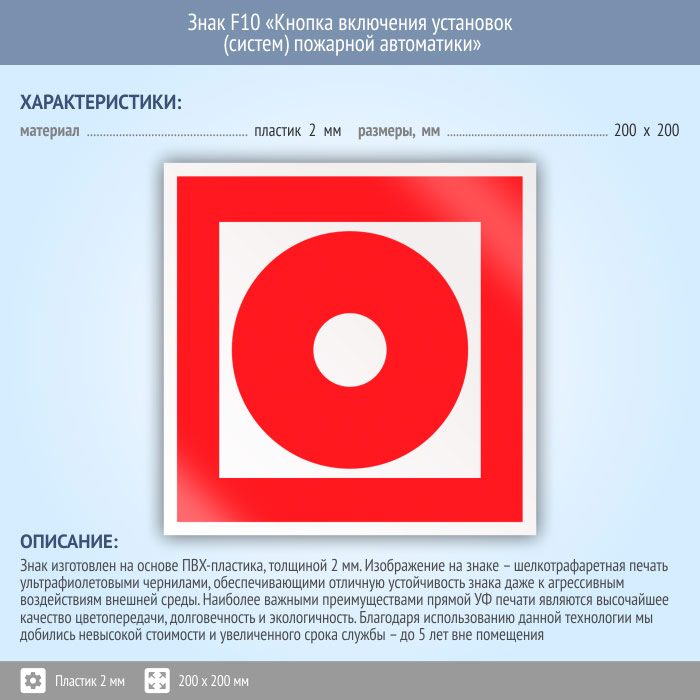 Знак F10 «Кнопка включения установок (систем) пожарной автоматики» (пластик, 200х200 мм) в Омске купить