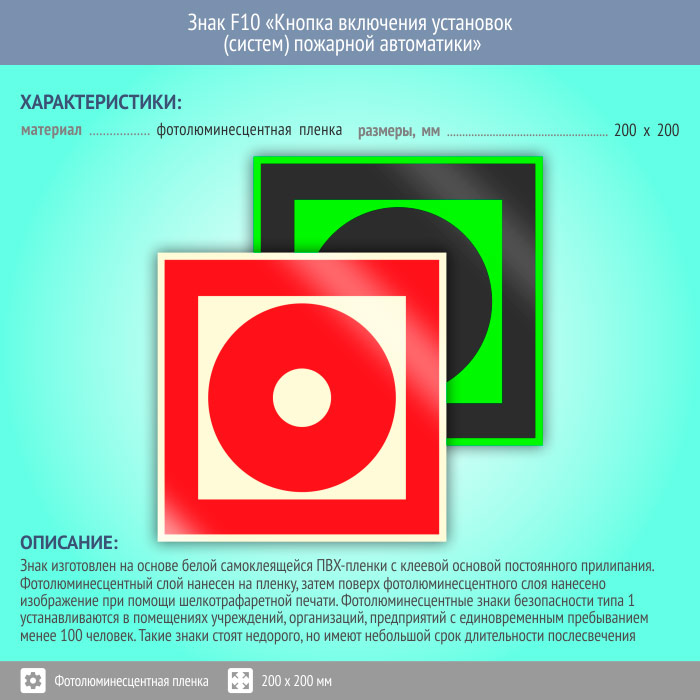 Знак F10 «Кнопка включения установок (систем) пожарной автоматики» (фотолюминесцентная пленка, 200х200 мм) в Омске купить