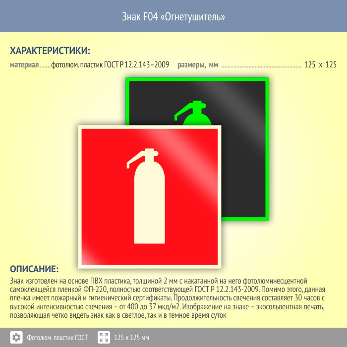 Знак F04 «Огнетушитель» (фотолюминесцентный пластик ГОСТ 34428-2018, 125х125 мм) в Омске купить